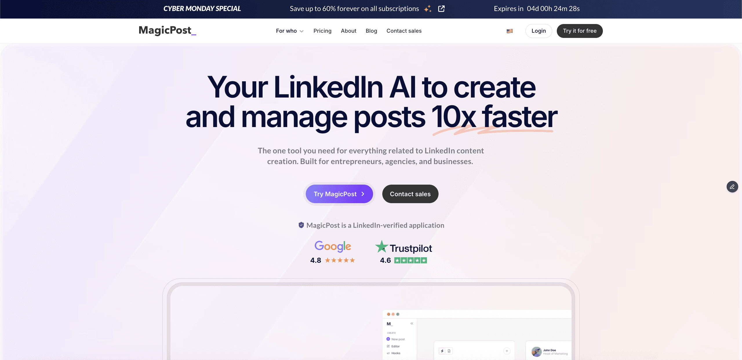 The first option is MagicPost, an AI tool made to help you create LinkedIn posts easily and effectively.