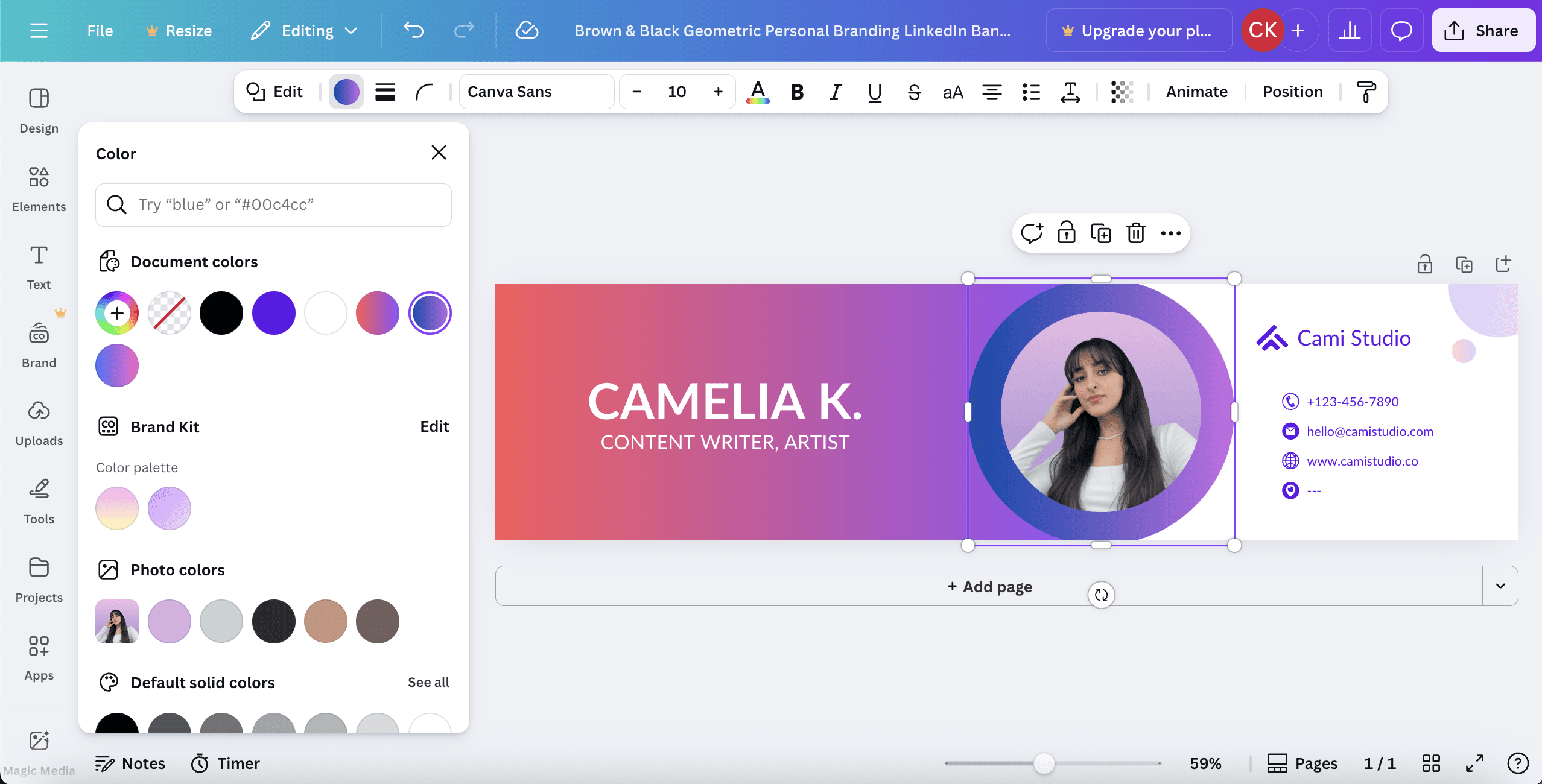 You can change your photo, name, design shapes, text, add a logo or call-to-action, and choose from many colors using the gradient option.