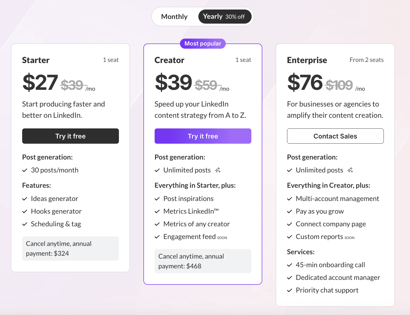 A cheaper alternative is MagicPost, with plans like Starter at $39/mo, Creator at ~$59/mo, and an Enterprise option for larger teams, focused specifically on LinkedIn content creation and scheduling. (magicpost.in)