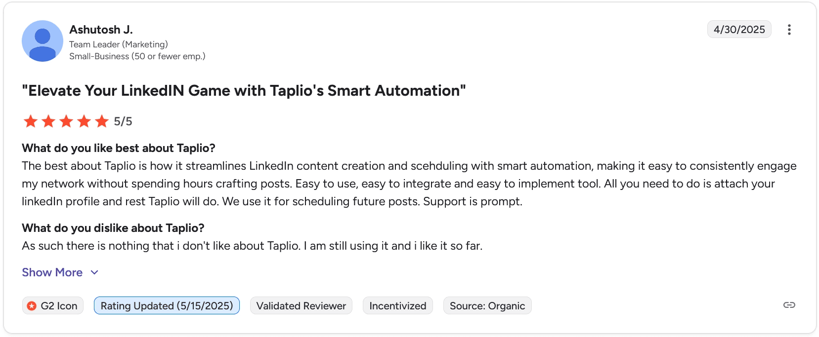 Taplio has a 3.9/5 rating on G2 based on 7 reviews as of March 2026. It's a small sample, but the feedback is consistent enough to draw some honest conclusions.