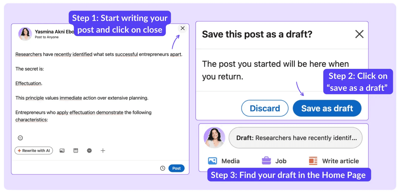 LinkedIn te dará la opción de guardar tu publicación como borrador.