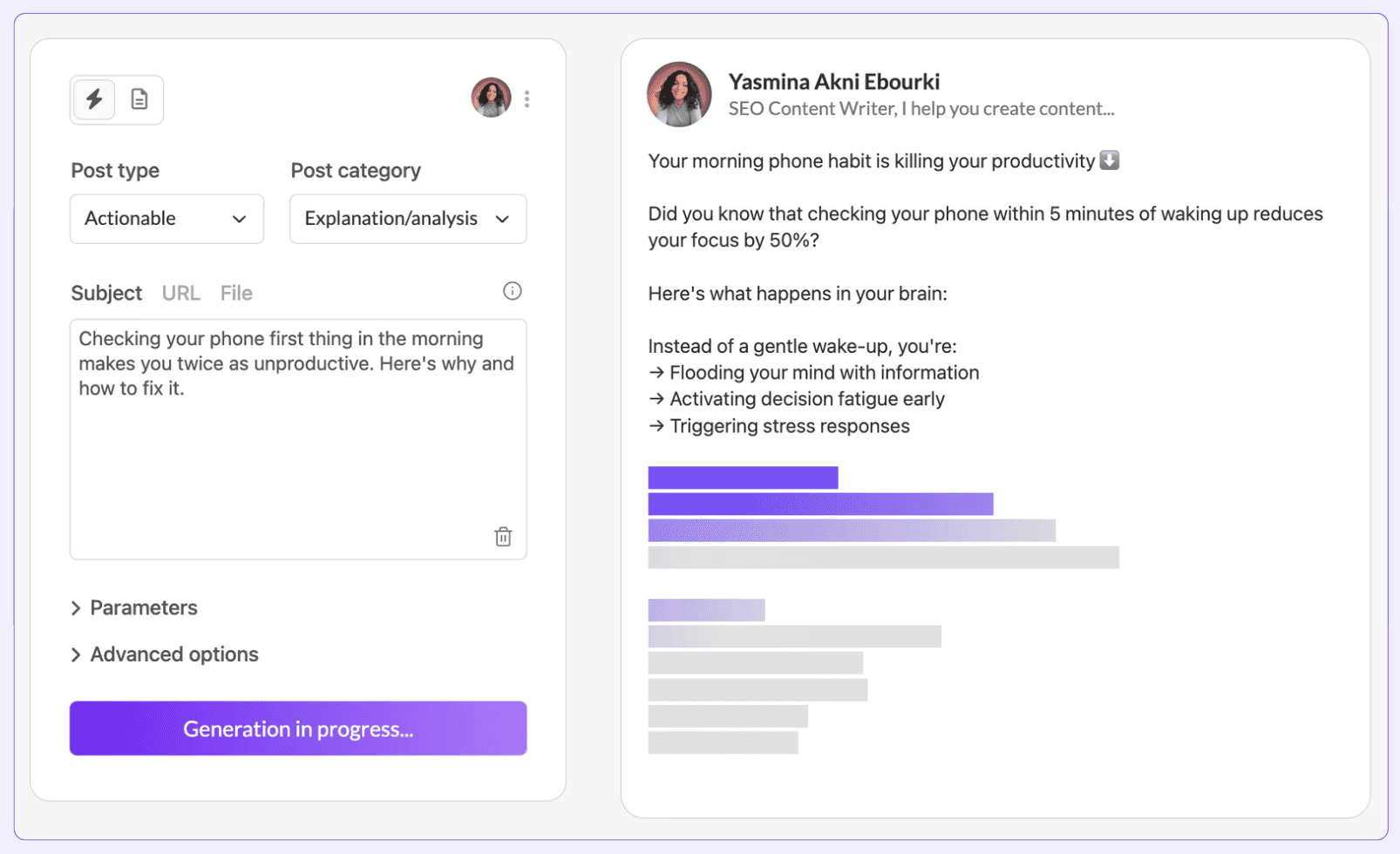 Puedes empezar usando herramientas como MagicPost o ChatGPT. Solo tienes que darles una indicación breve y la IA generará un borrador del post. Luego, lo editas, le das formato, añades emojis y lo organizas para que sea fácil de leer.