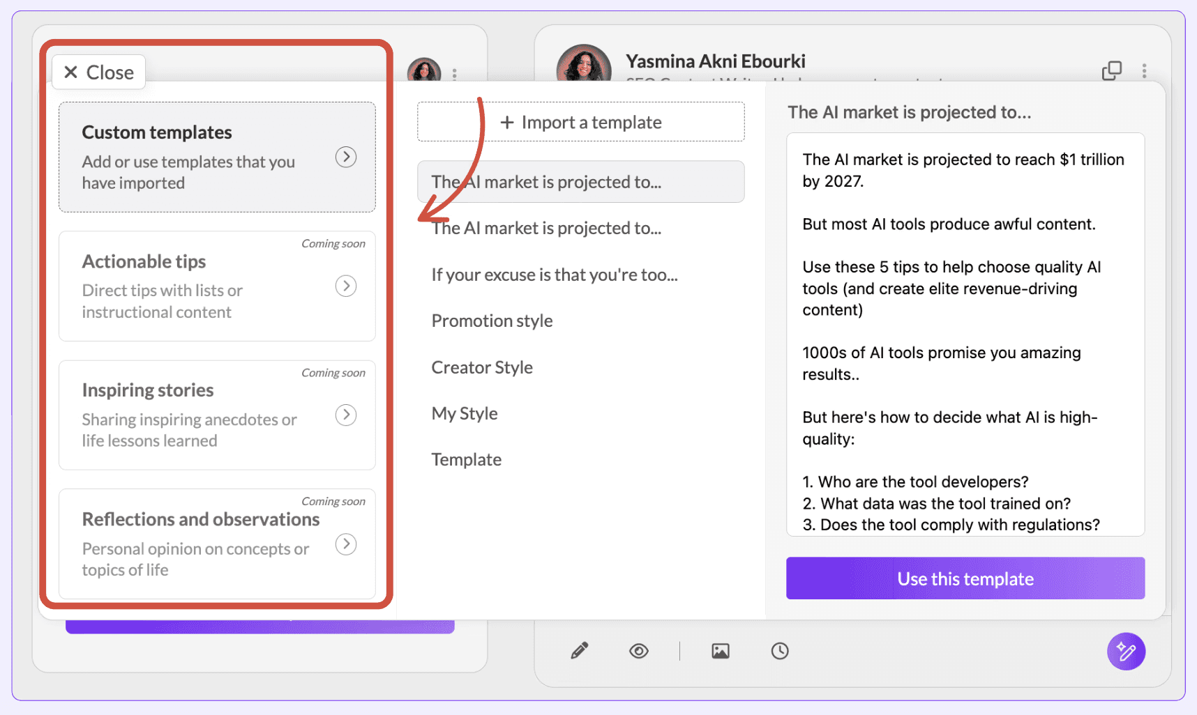 MagicPost te permite guardar esas estructuras como plantillas y pedirle a la inteligencia artificial que las use para tus nuevas publicaciones. Además, puedes nombrar cada plantilla para organizarlas fácilmente según el tono, el objetivo o el tema.