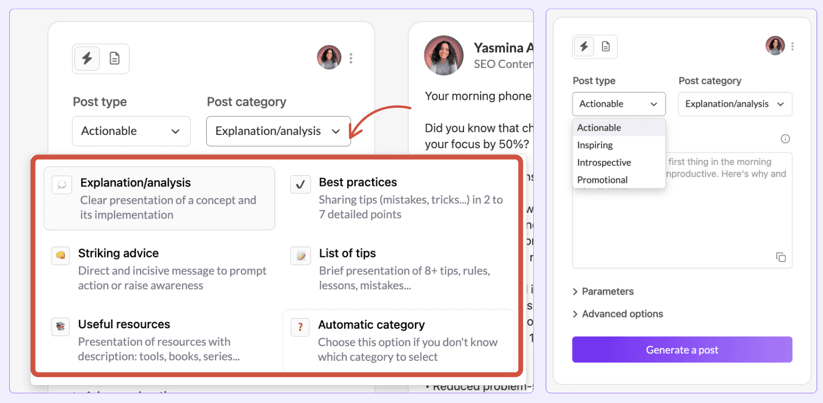 Con MagicPost, solo tienes que indicar a la inteligencia artificial sobre qué quieres escribir. Después, eliges el estilo del post y el objetivo que persigues. La herramienta se encarga del resto.