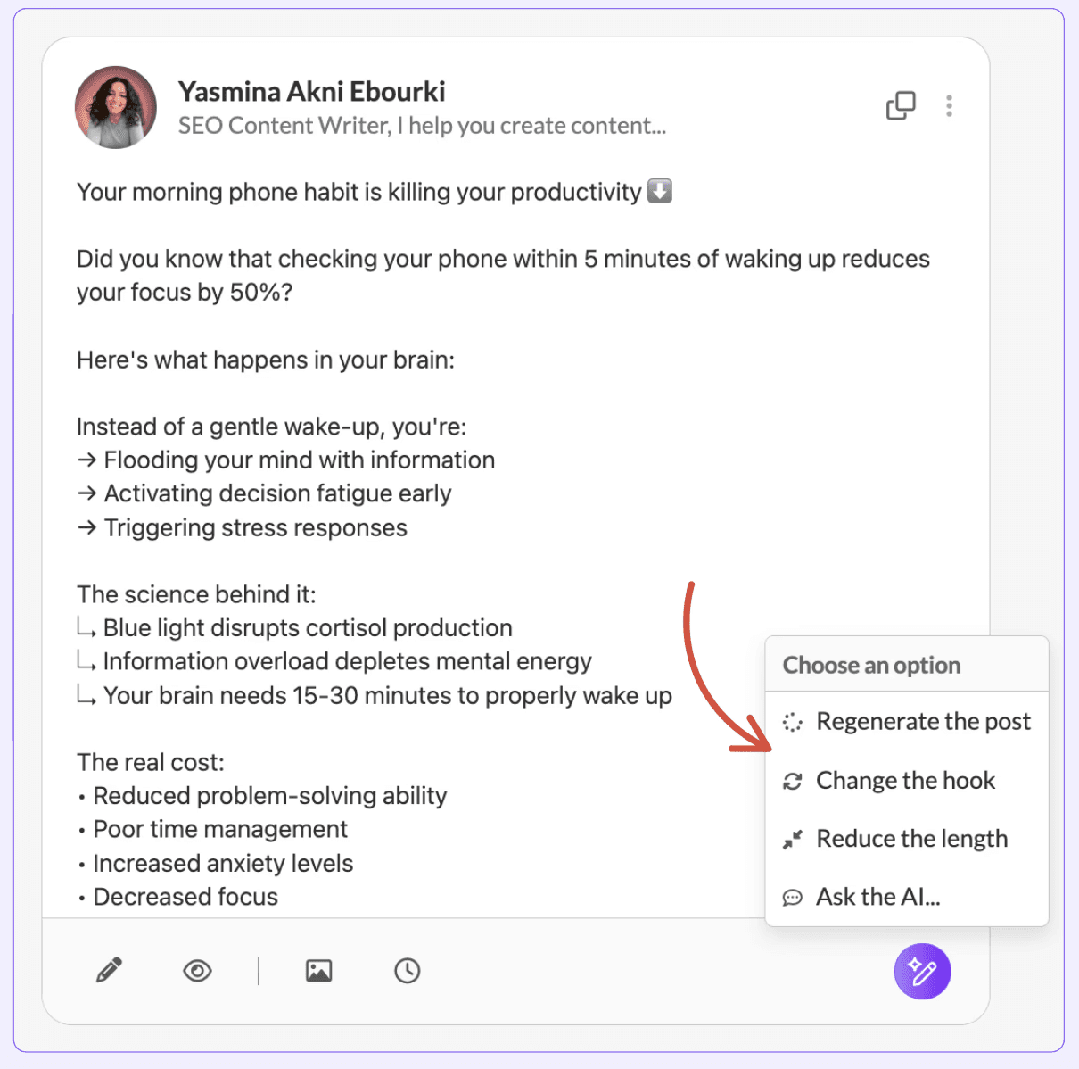 Cuando encuentres un post viral relacionado con tu nicho, puedes pedirle al editor con IA de MagicPost que lo adapte a tu estilo personal, evitando así limitarte a copiar tendencias.