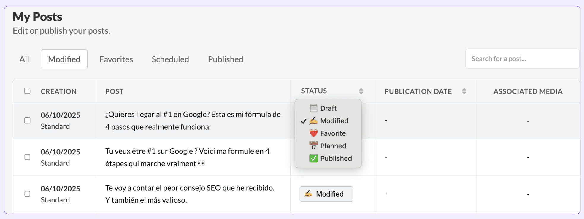 Puedes etiquetar cada publicación como borrador, modificada, favorita, planificada o publicada, para tener un control sencillo de todas las fases en tu flujo de trabajo.