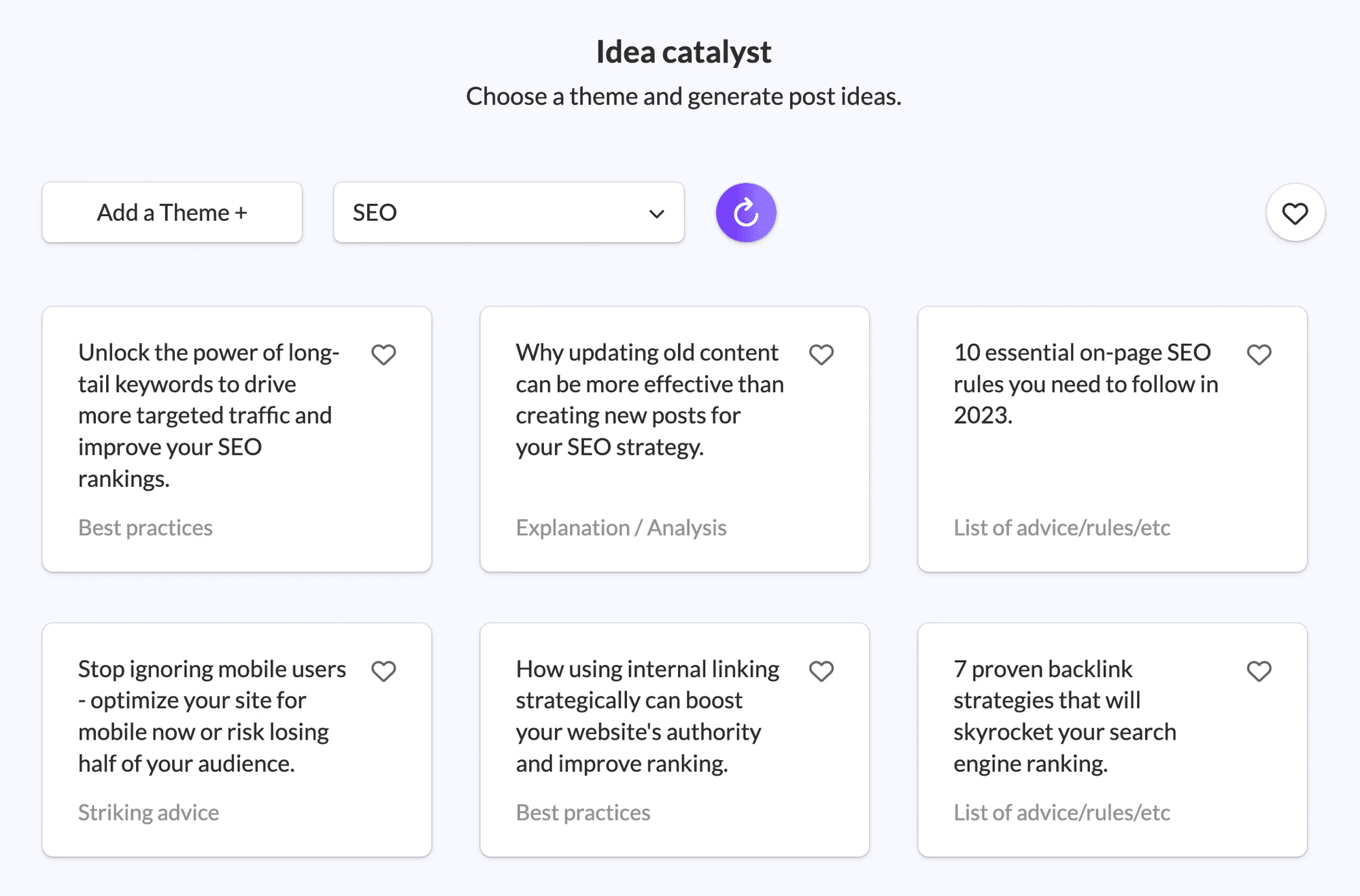 No tendrás que romperte la cabeza pensando temas: el generador de ideas te sugiere nuevos contenidos de forma automática.