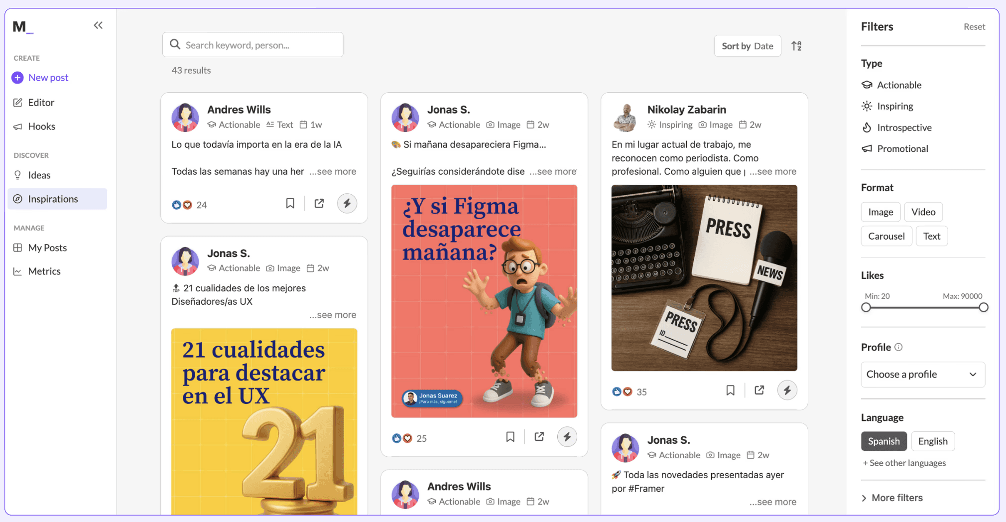 La herramienta te permite filtrar publicaciones virales en tu sector según formato, número de “me gusta”, fecha, idioma o extensión.