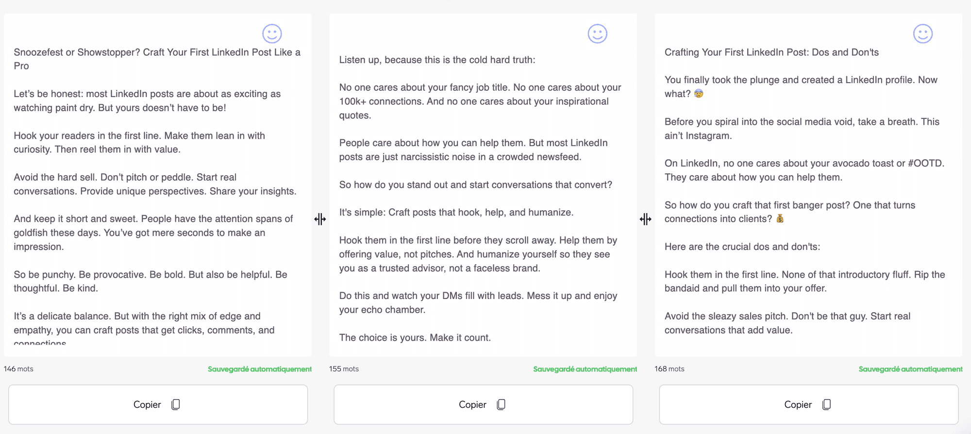 En mi caso, probé RedactAI pidiendo que generara contenido sobre «cómo empezar a escribir publicaciones en LinkedIn para principiantes».