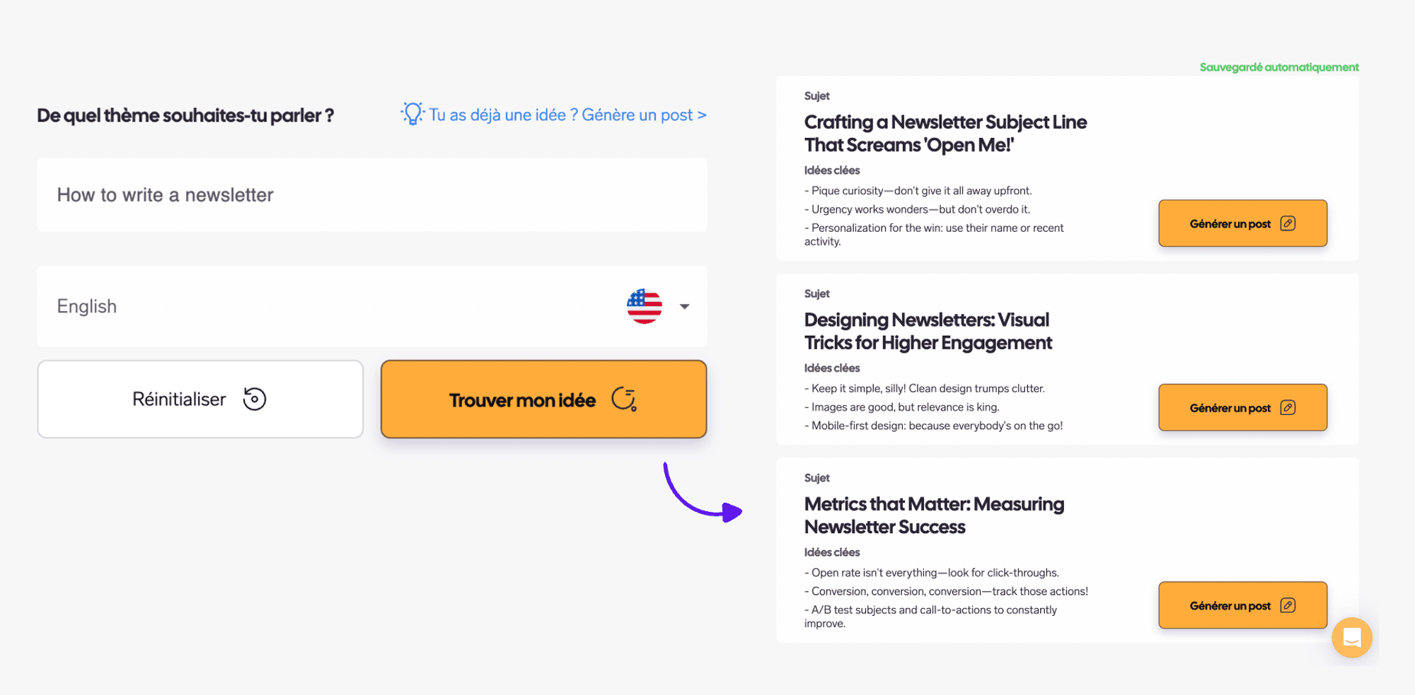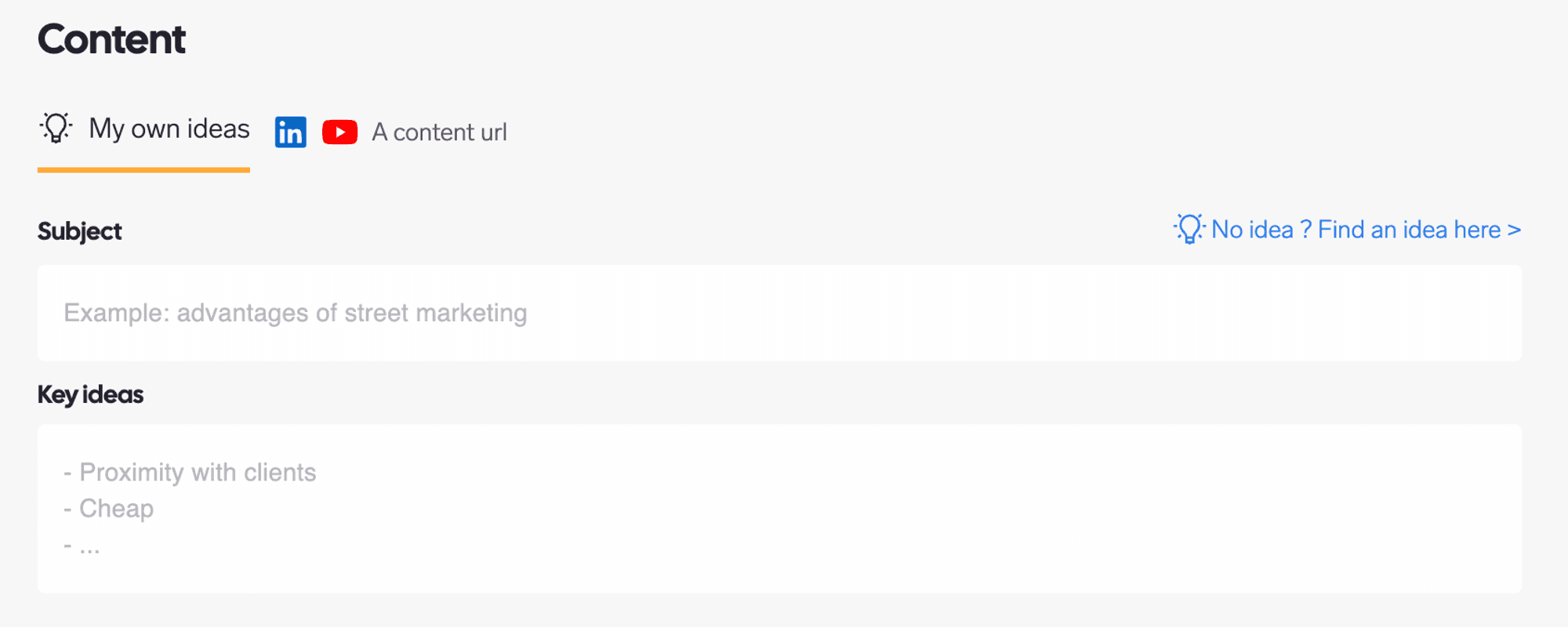 Su generador de ideas es similar a otras herramientas de IA: puedes definir un tema y el idioma en el que quieres desarrollarlo, y la plataforma te genera tres opciones distintas.