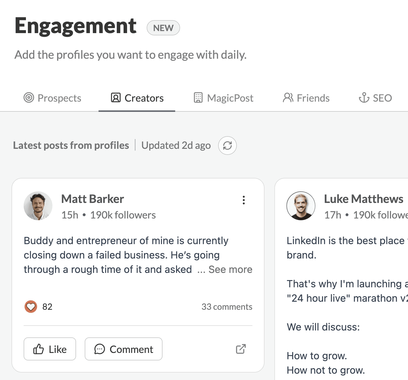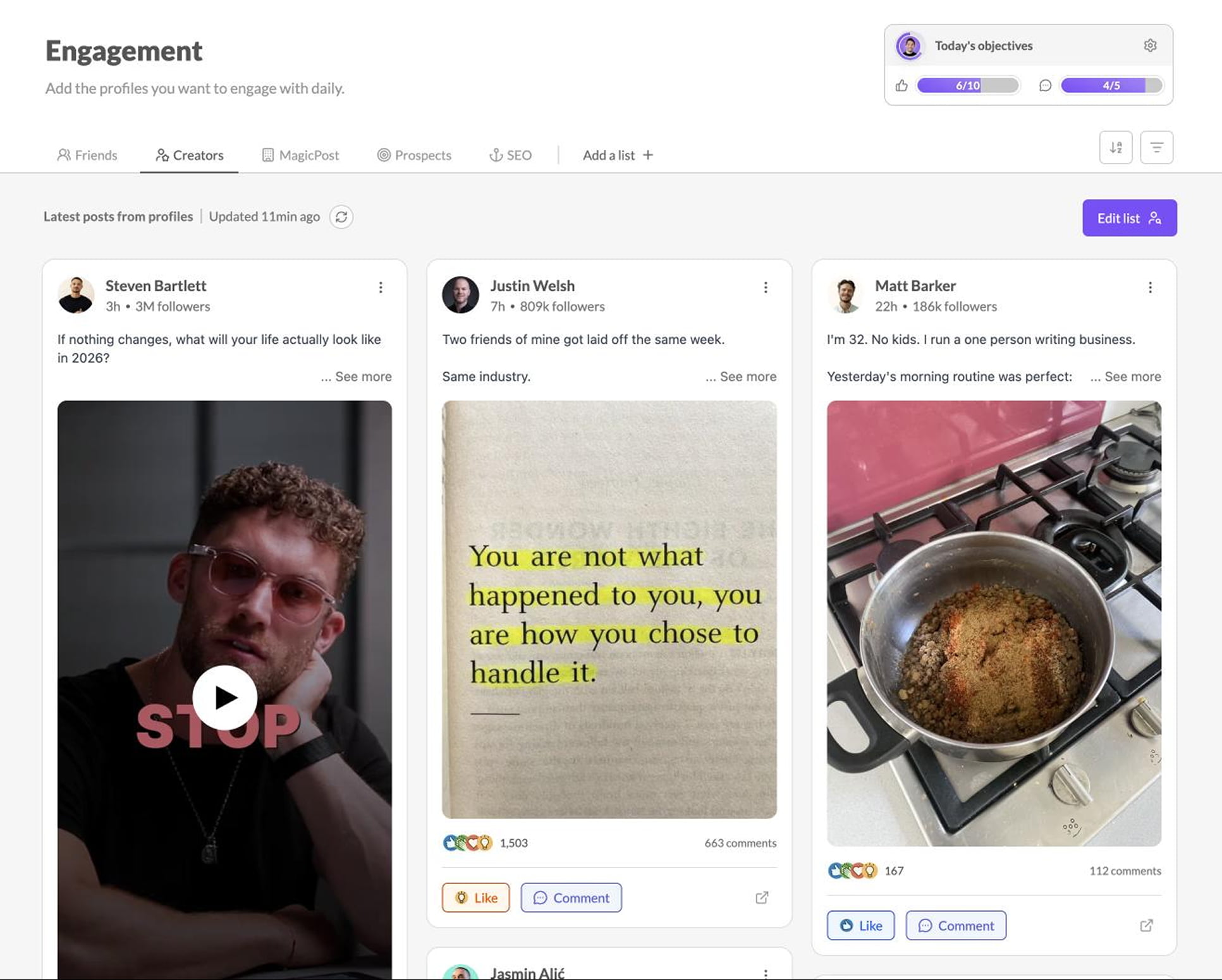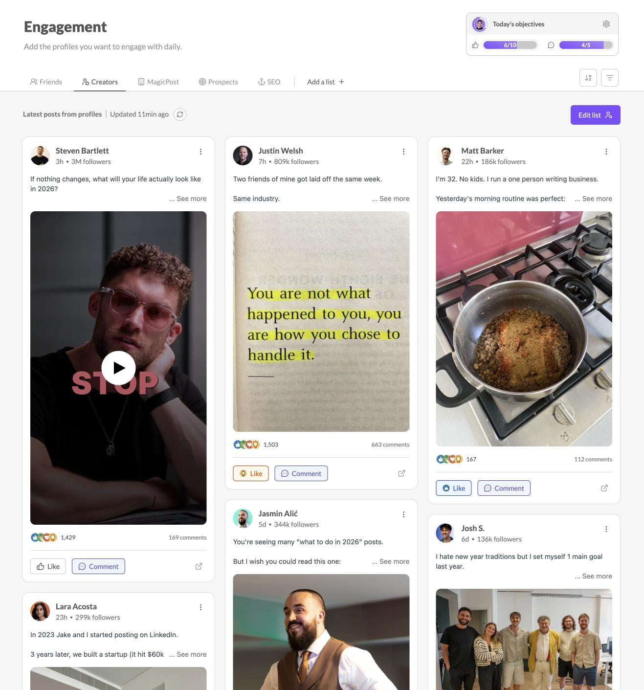 Within each list you'll be able to add up to 49 profiles. Their latest posts will be checked daily so you can engage easily with each of them!