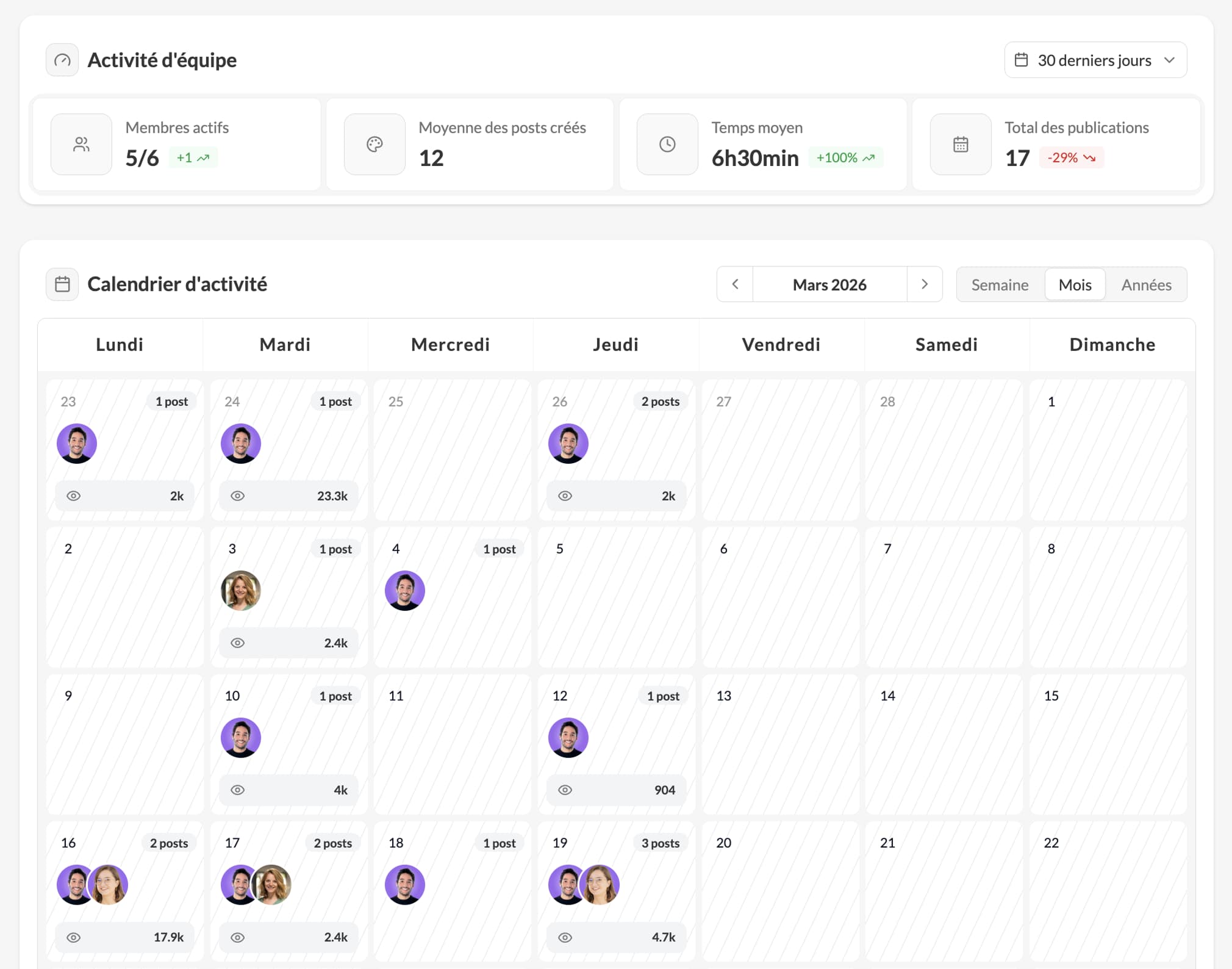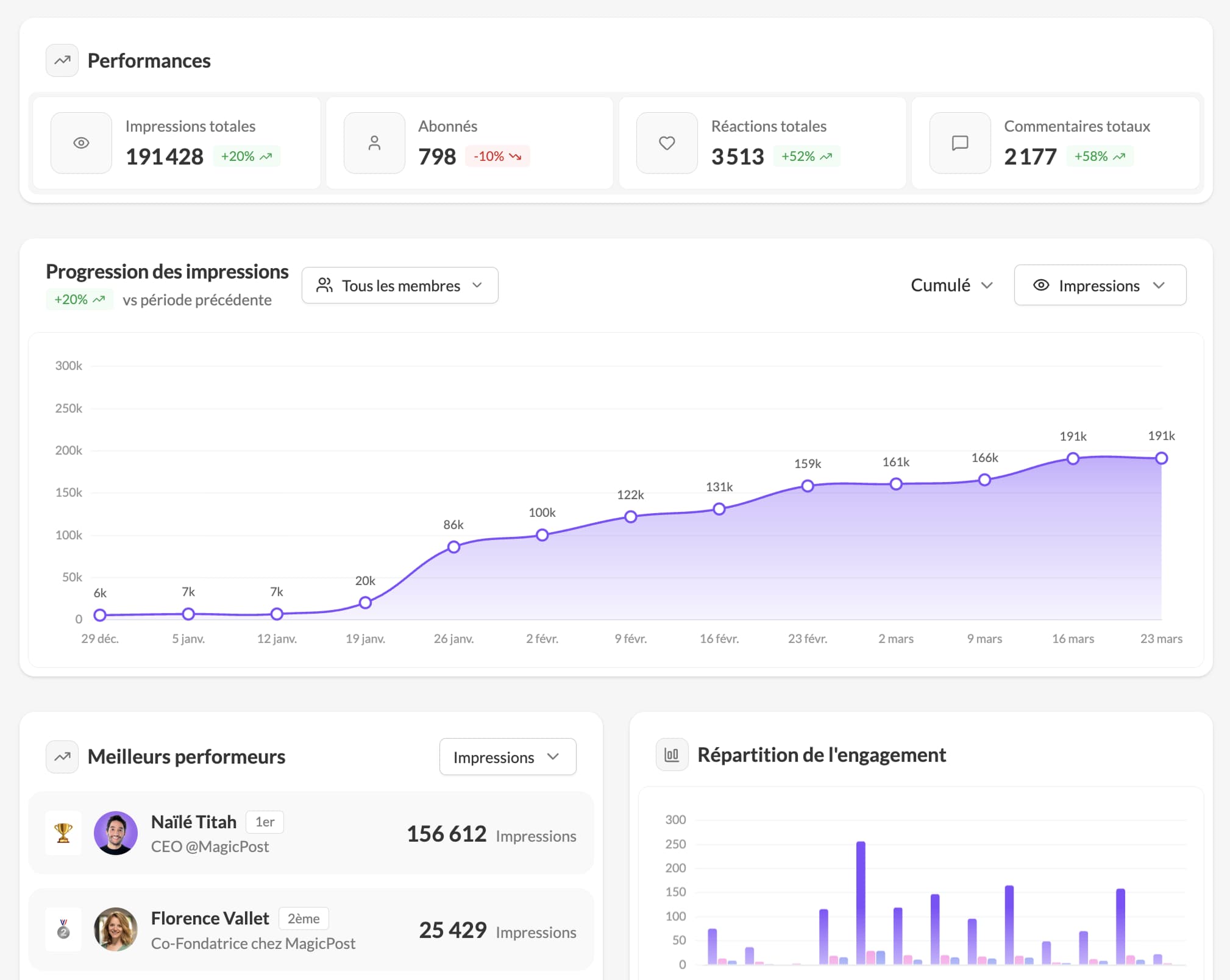 Accédez à des dashboards complets sur les performances de votre équipe : impressions totales, abonnés gagnés, tops performers…