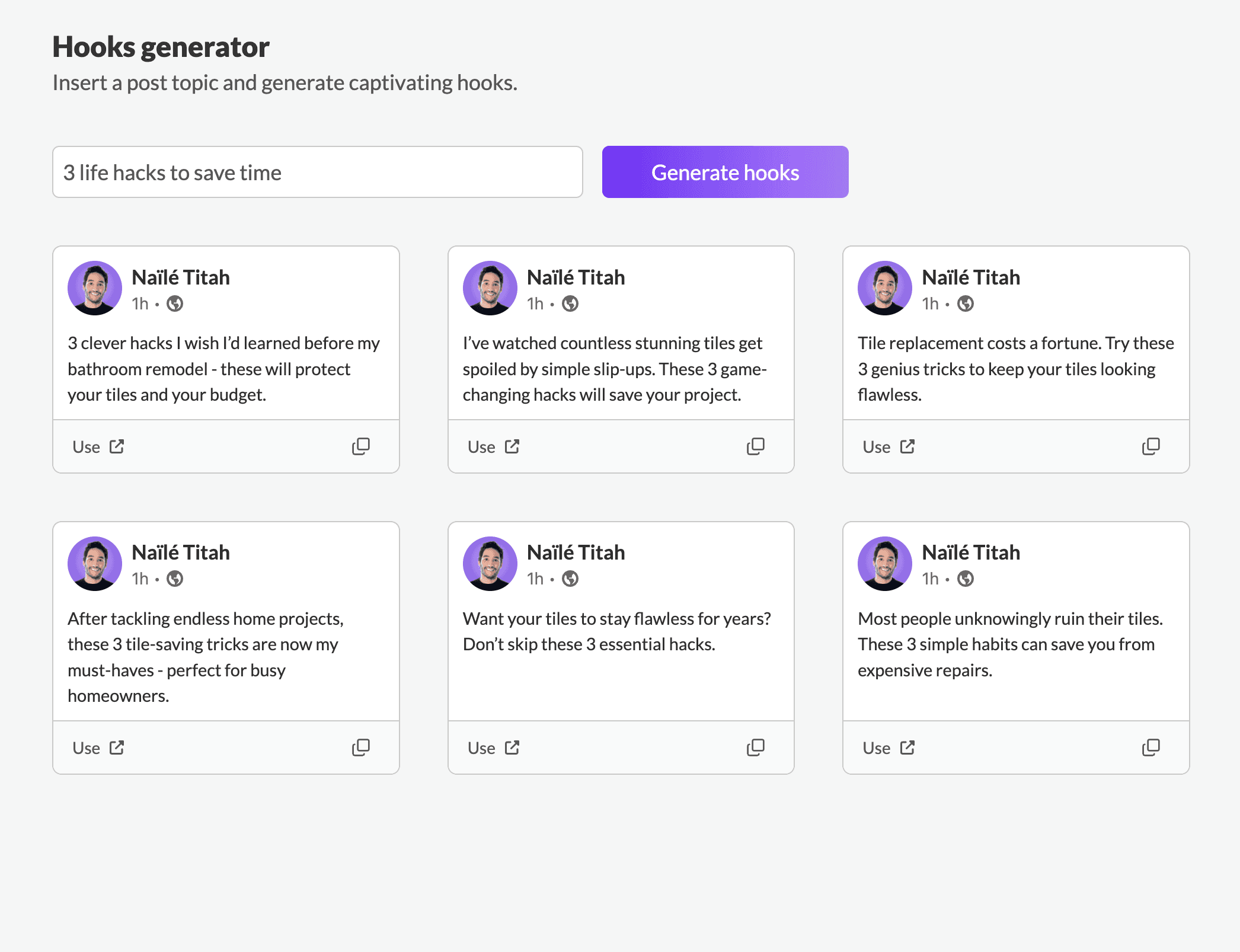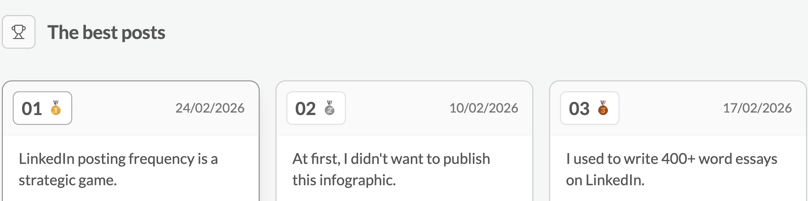Testez différentes ouvertures, suivez ce qui fonctionne et découvrez ce à quoi votre public réagit. Au fil du temps, MagicPost vous aide à construire une bibliothèque personnelle d'accroches qui se renforce avec chaque publication.
