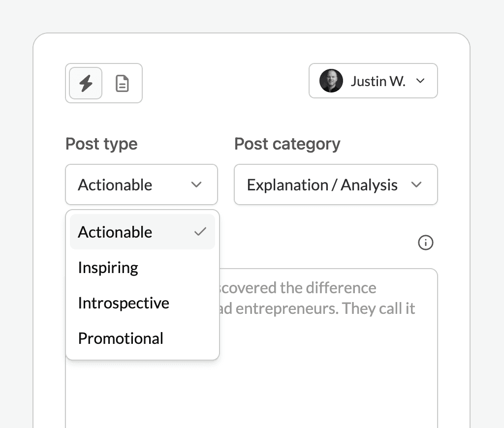 Choisissez parmi quatre types de publication différents : Actionnable, Inspirant, Introspectif & Promotionnel.
