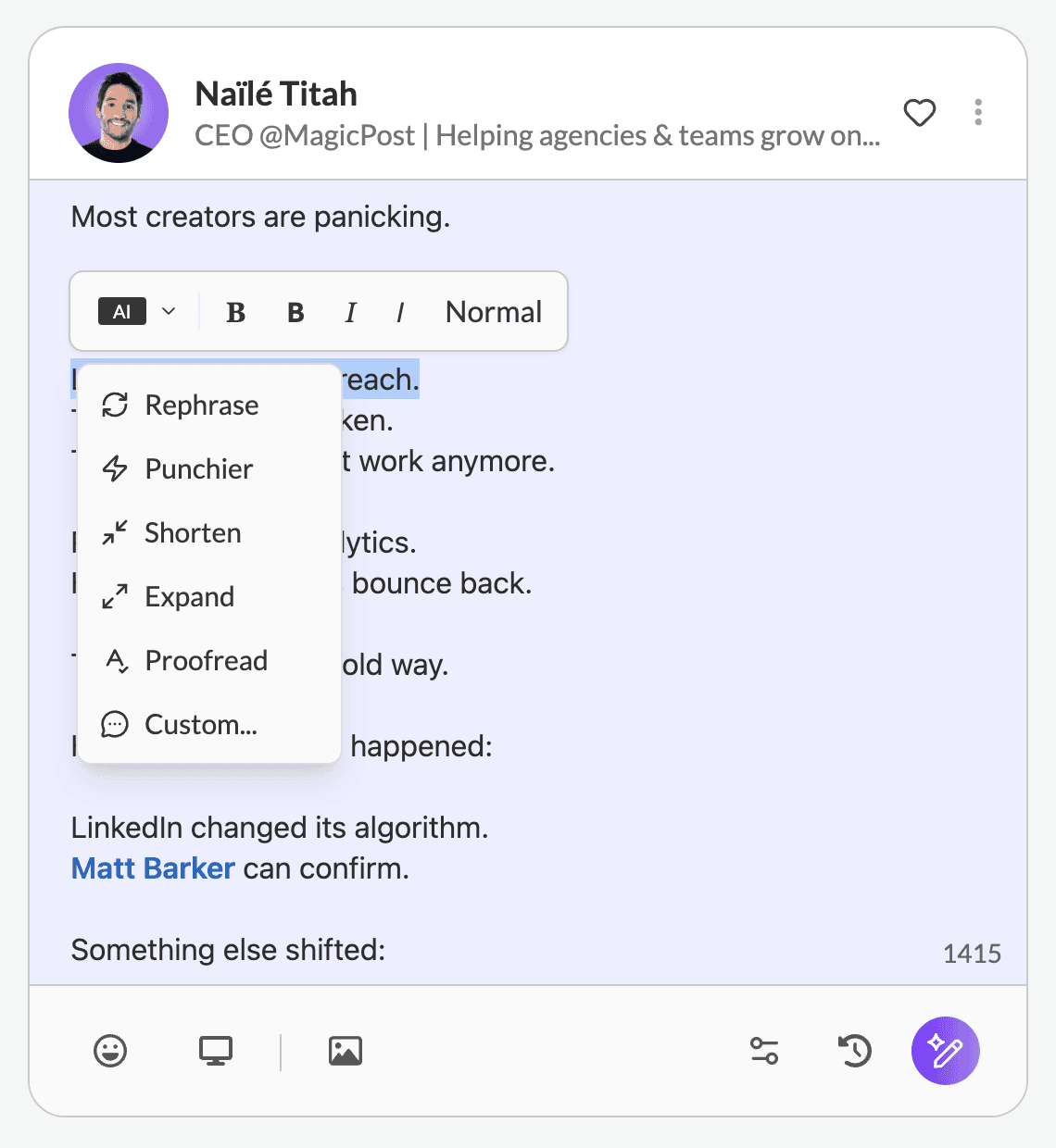 Une fois votre publication générée, vous pouvez facilement y revenir et apporter des ajustements de dernière minute. Ou, en utilisant les outils d’IA, réduire la longueur, modifier l’accroche, voire réécrire toute la publication.