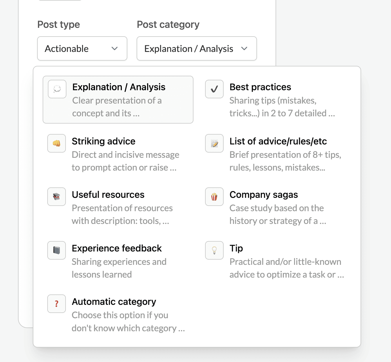 Chaque type de publication possède différentes catégories de publication pour vous guider dans toutes vos occasions de publication.