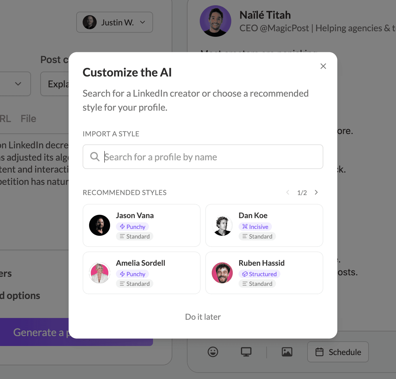 Vous aurez également la possibilité d'importer le style d'écriture de n'importe quelle personne. Les publications générées correspondront parfaitement à la structure du style d'écriture .