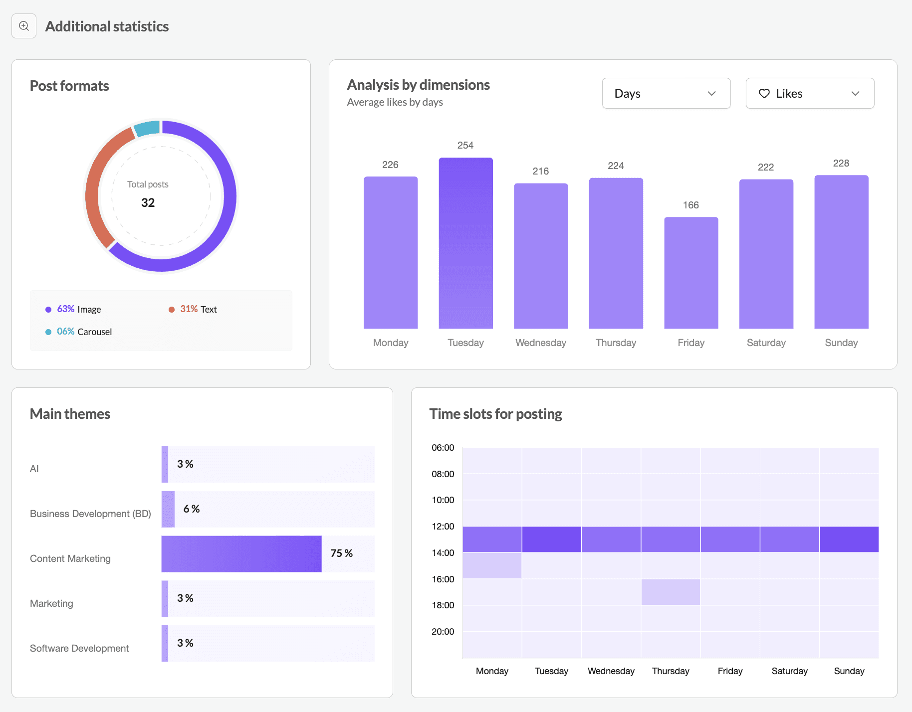 MagicPost affiche également vos formats de publication les plus utilisés, les jours qui fonctionnent le mieux pour votre audience, et même jusqu’aux horaires. MagicPost vous montre aussi les thèmes dont votre page parle le plus.