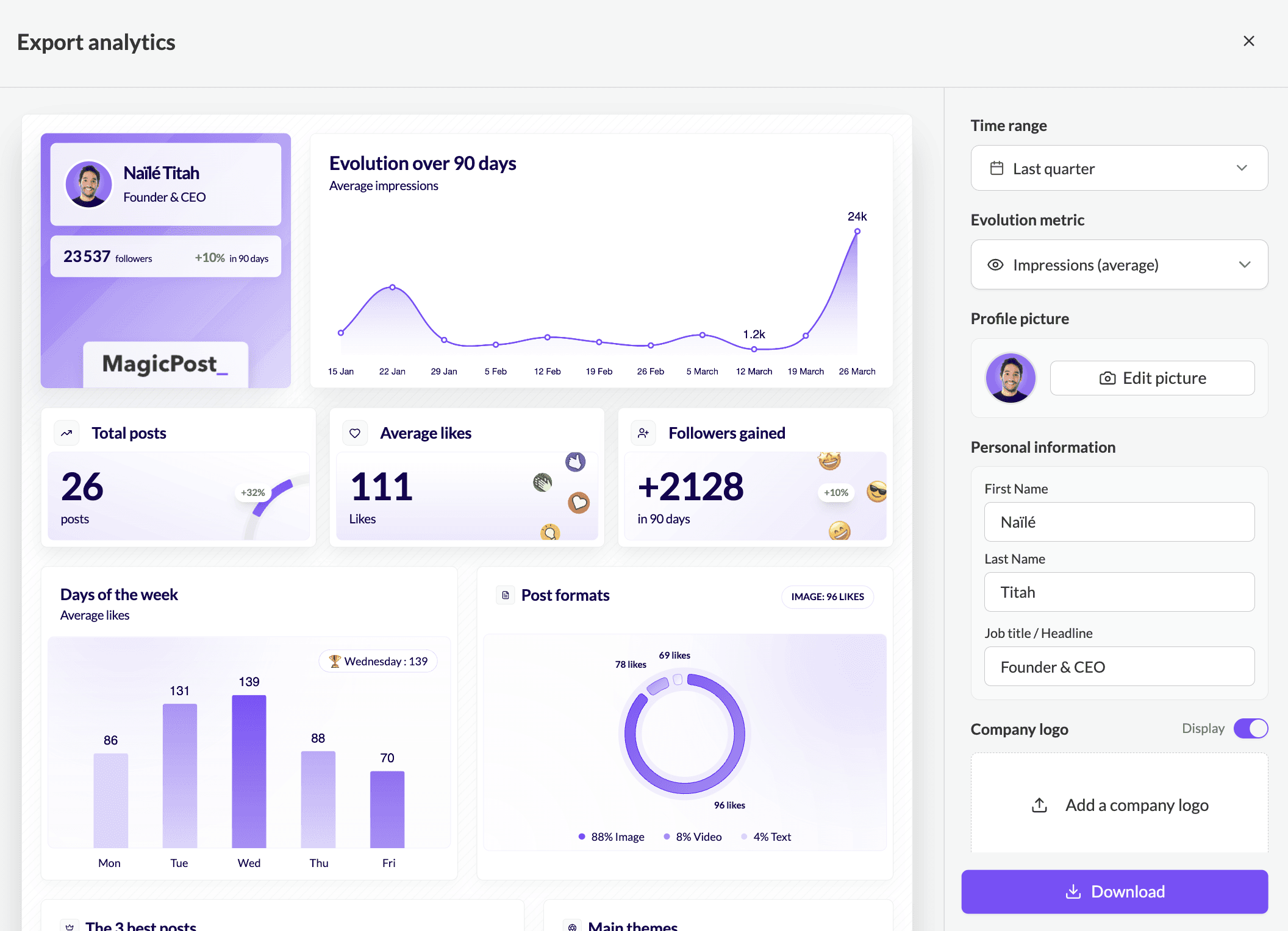 Obtenez des rapports hautement personnalisables que vous pouvez partager sur LinkedIn ou avec vos clients si vous êtes une agence.