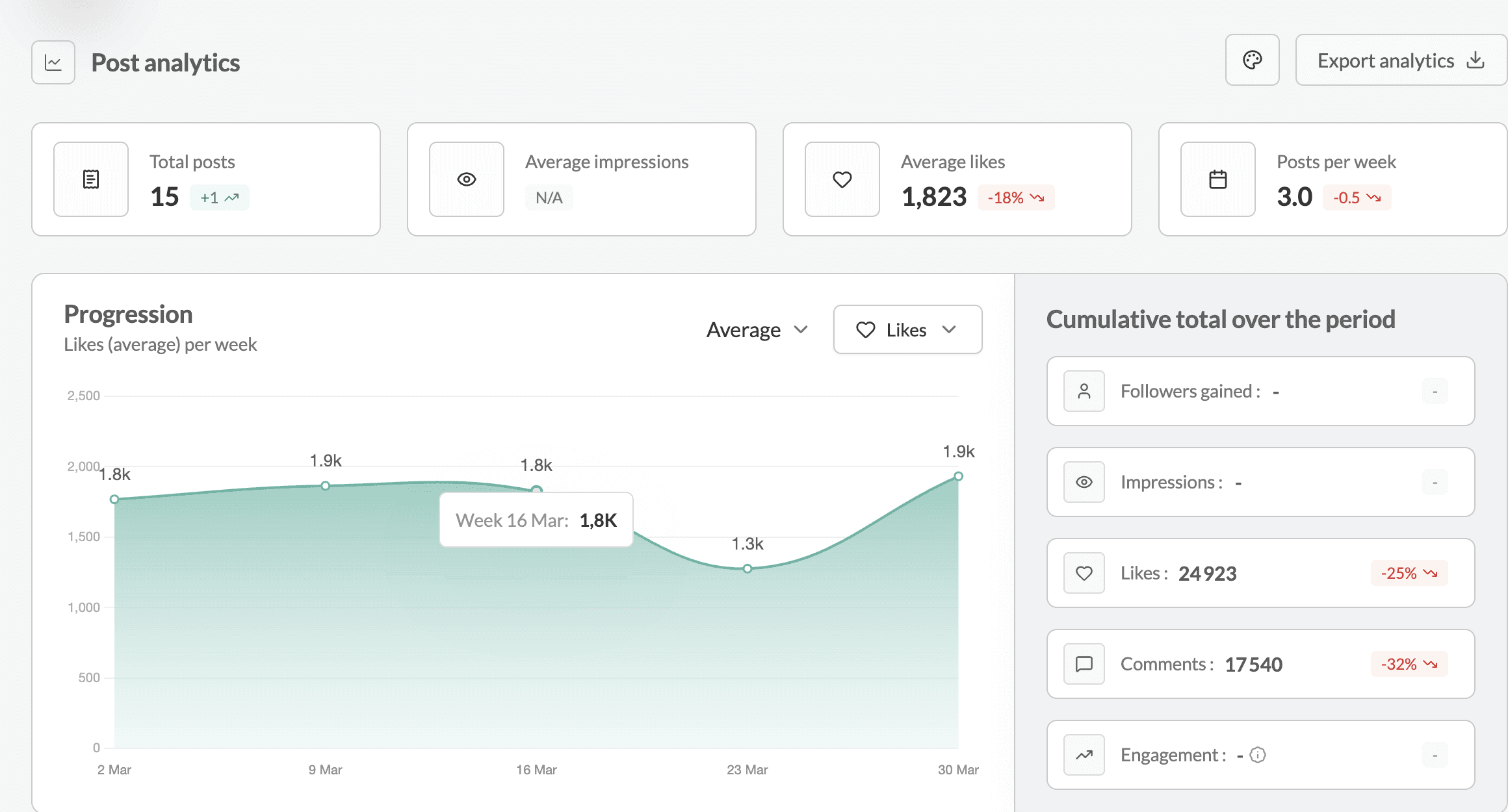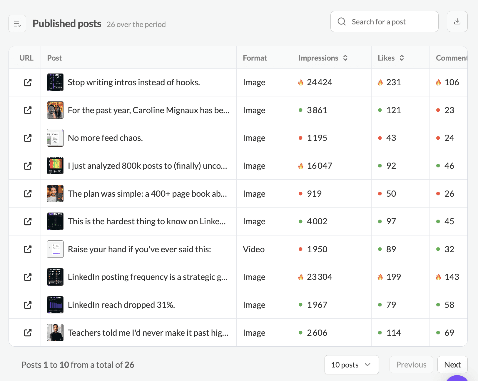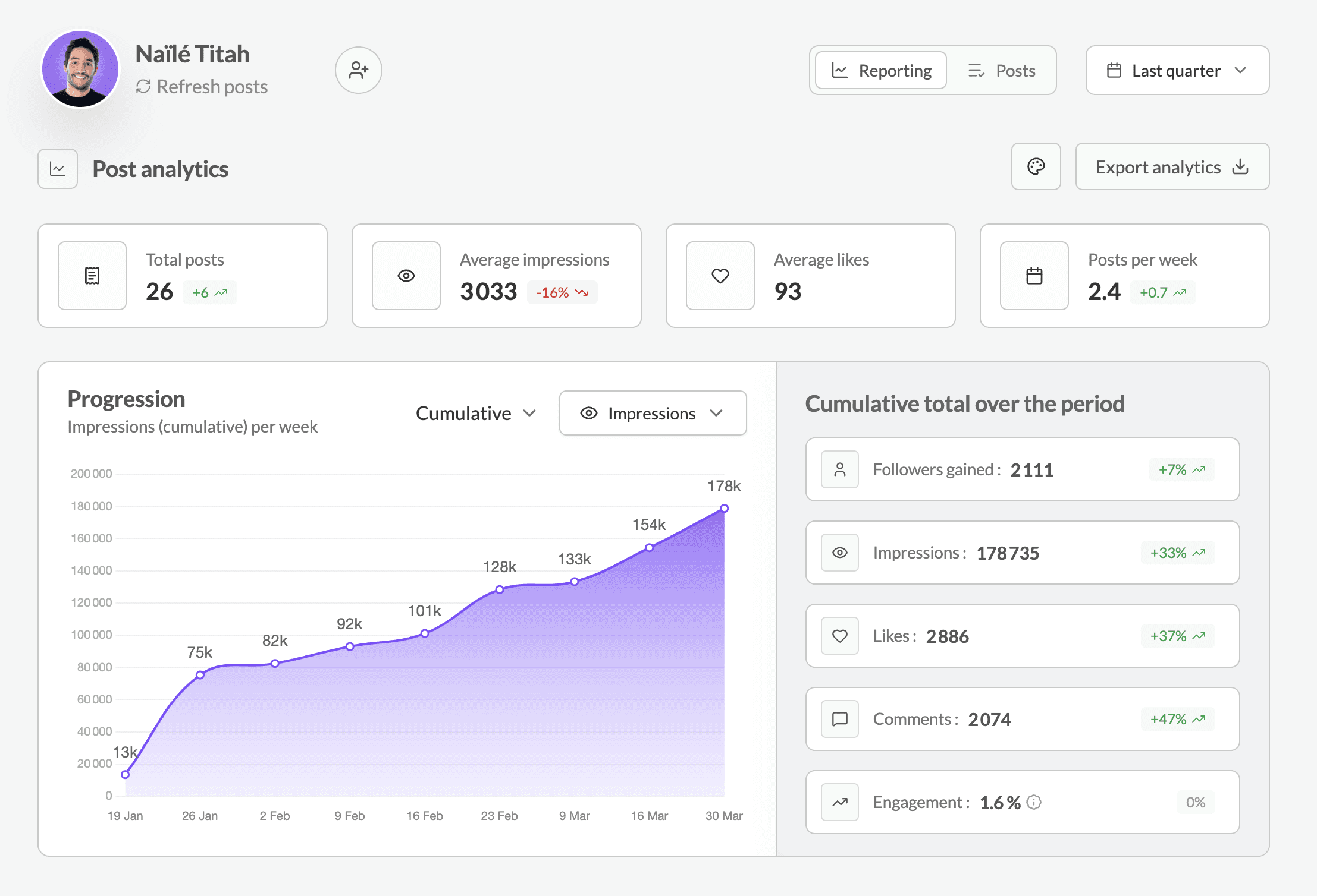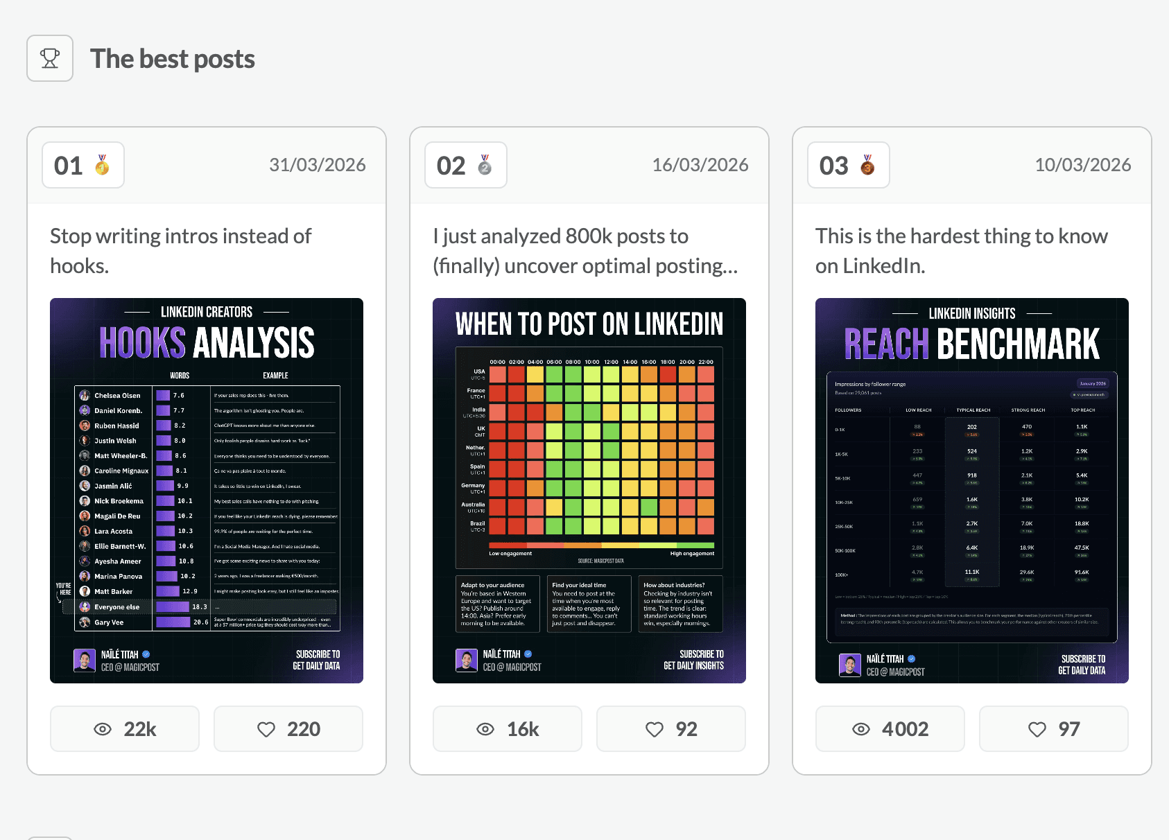 Mettez en avant vos publications les plus performantes sur LinkedIn. Voyez exactement quel contenu a généré le plus de vues et d’engagement.