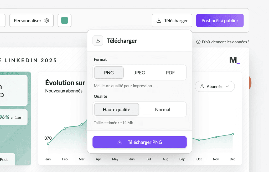 Une fois votre rétrospective générée, vous pourrez la télécharger en format PNG et la partager sur LinkedIn. Un post prêt à l'emploi avec toutes vos stats de 2026
