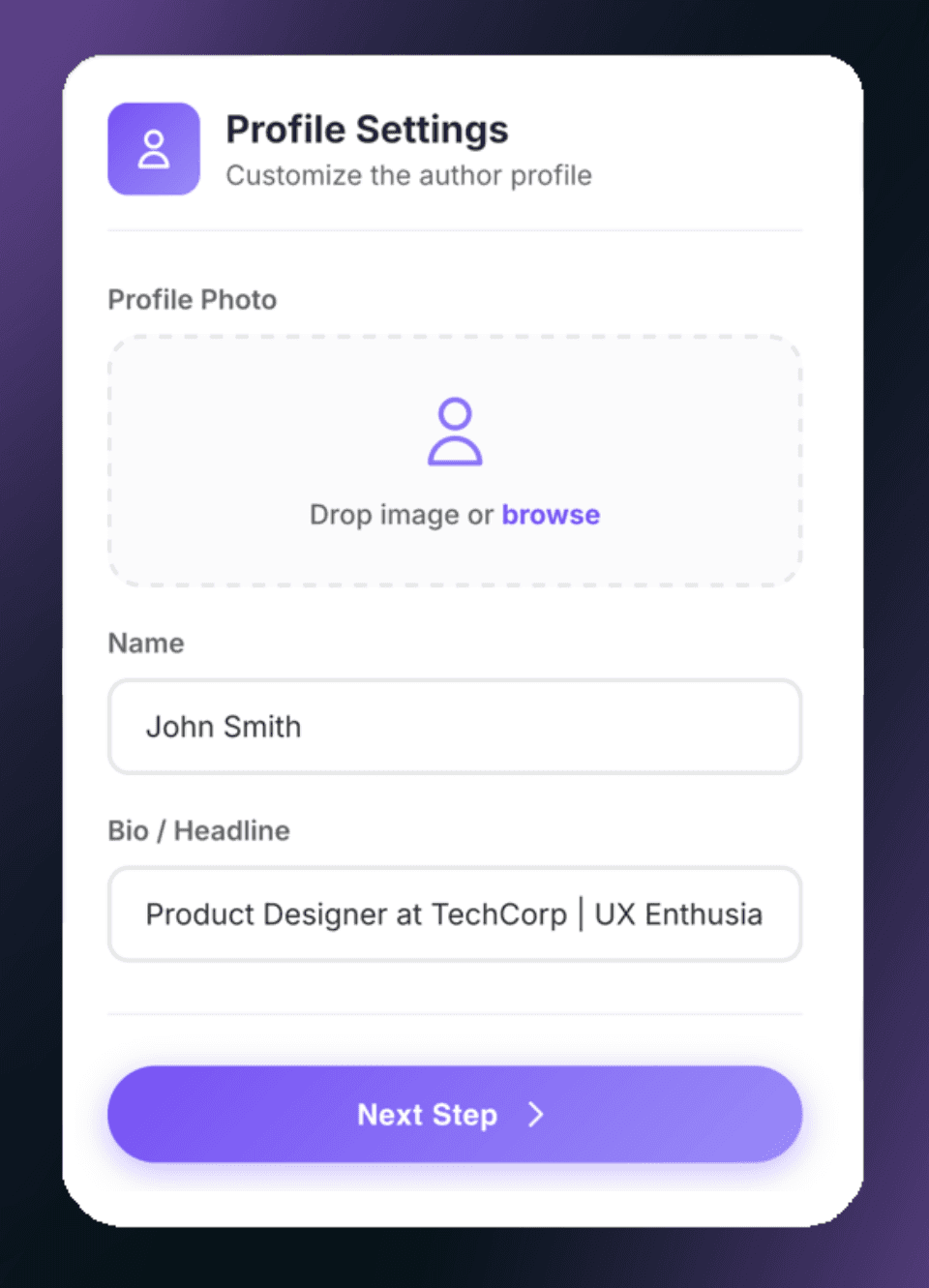 Upload a profile photo, add a name, and write a headline to match the author you want to display.