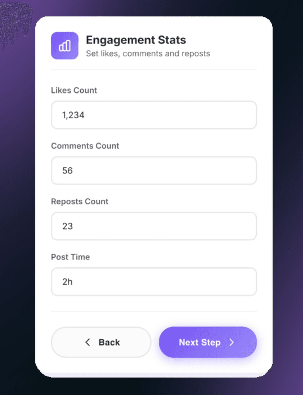 Adjust reactions, comments, reposts, and visual elements to see how the post will look in the feed.