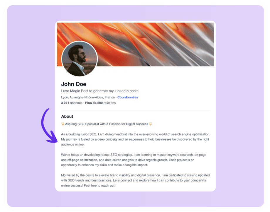 You can find your "About Me" section (also known as your bio) directly on your LinkedIn profile, right below your profile picture. This section is where you introduce yourself, highlight your expertise, and share what makes you unique.