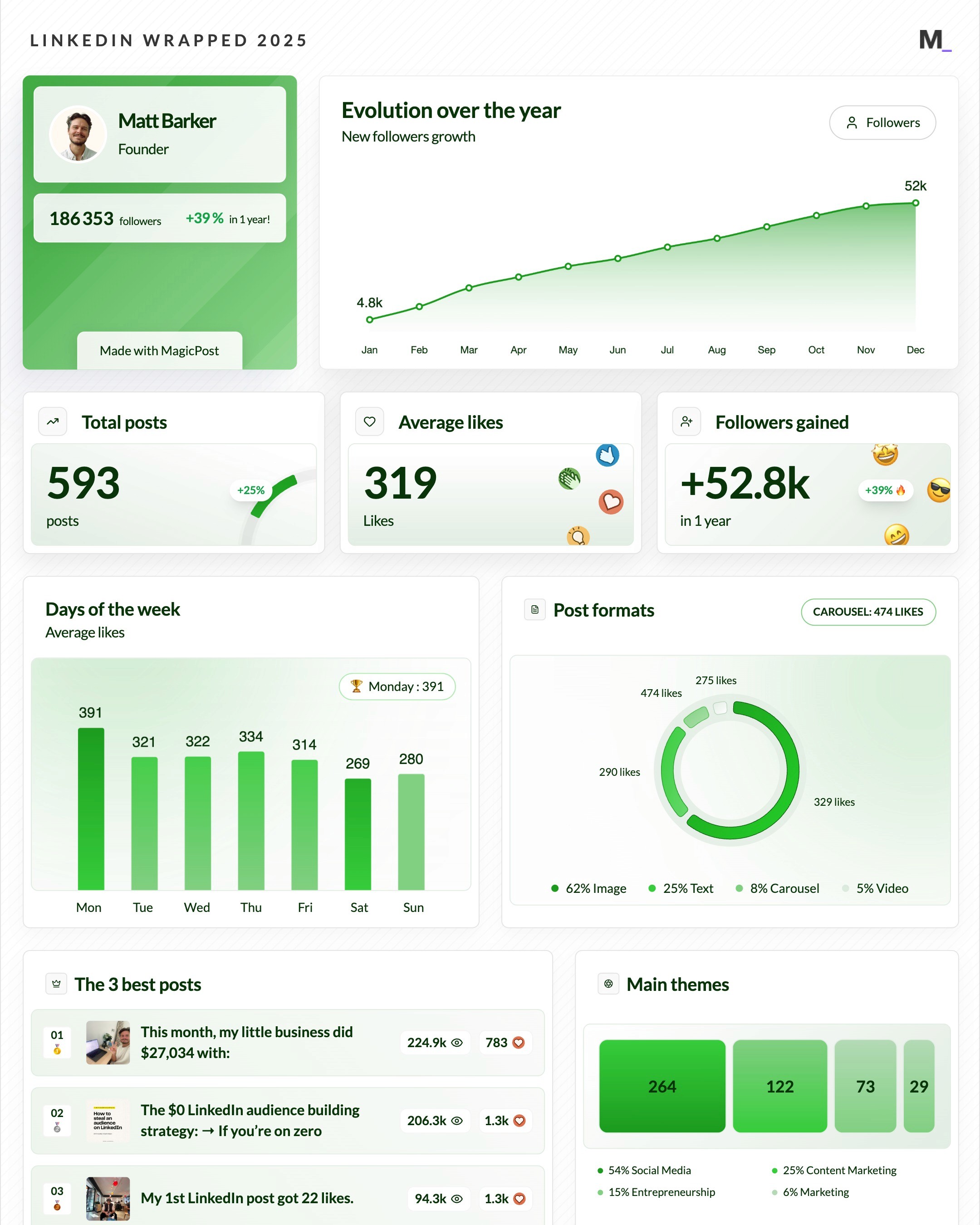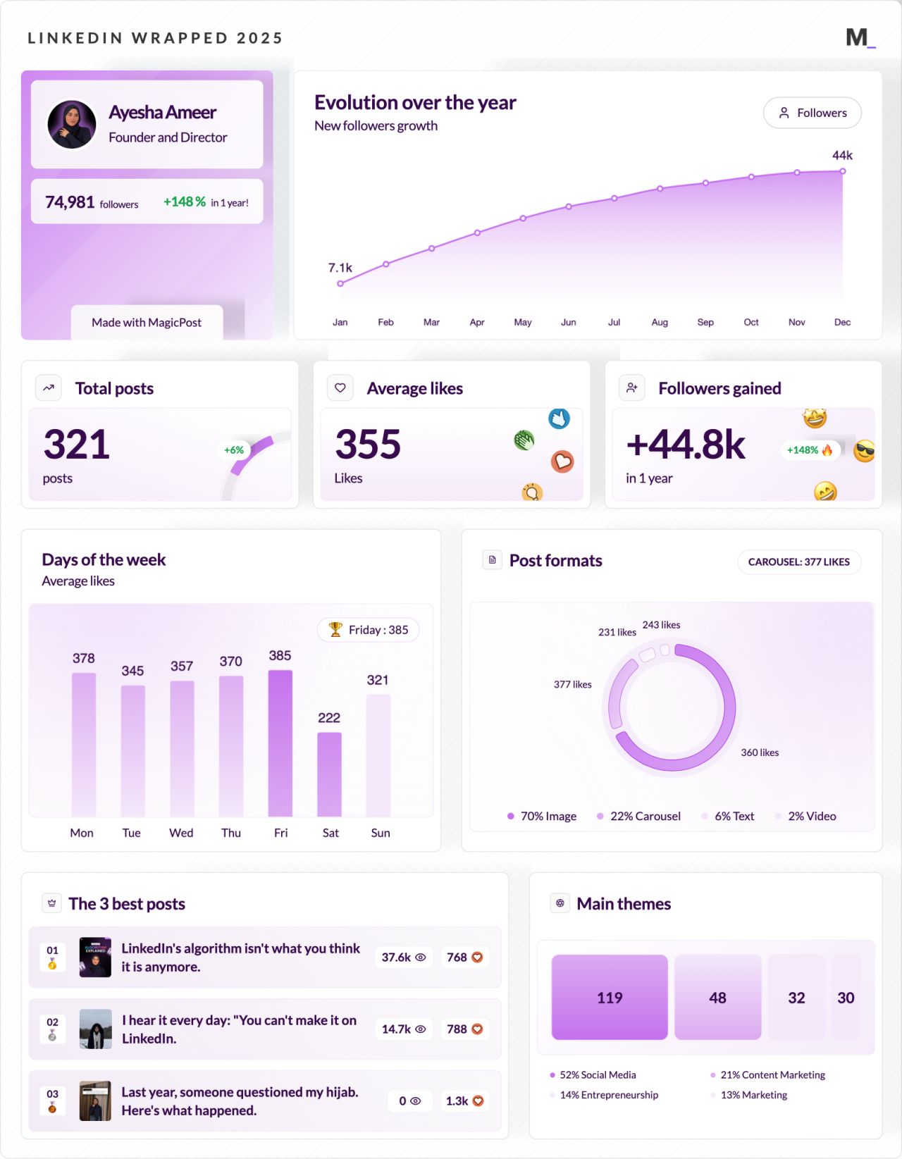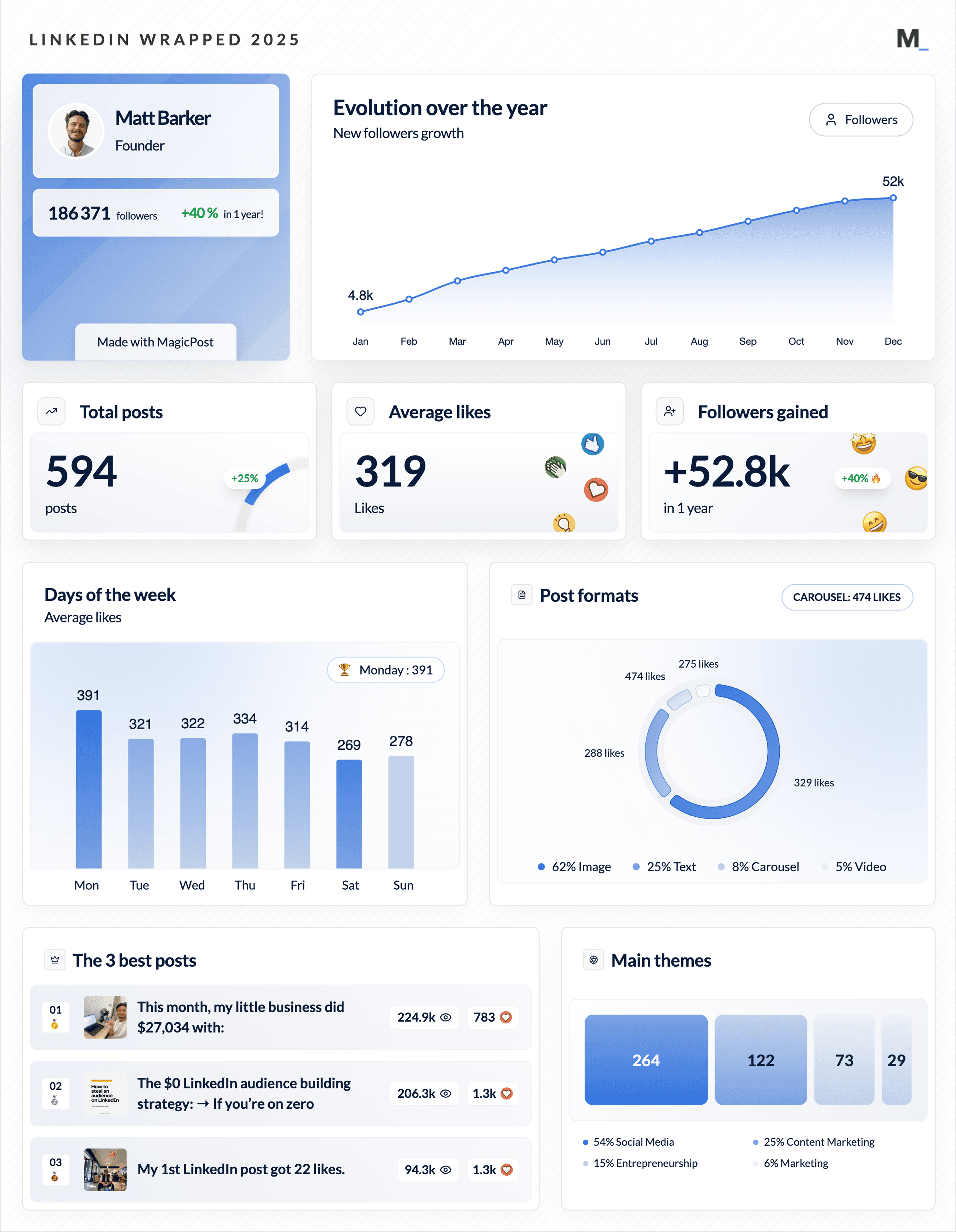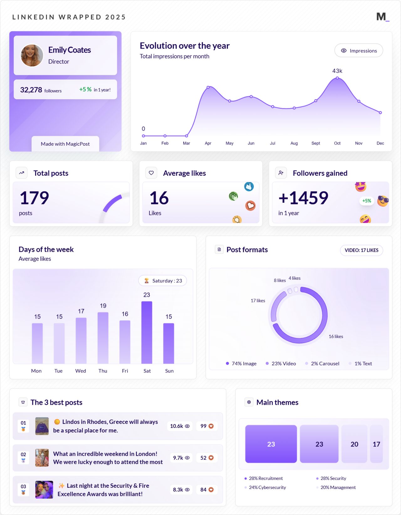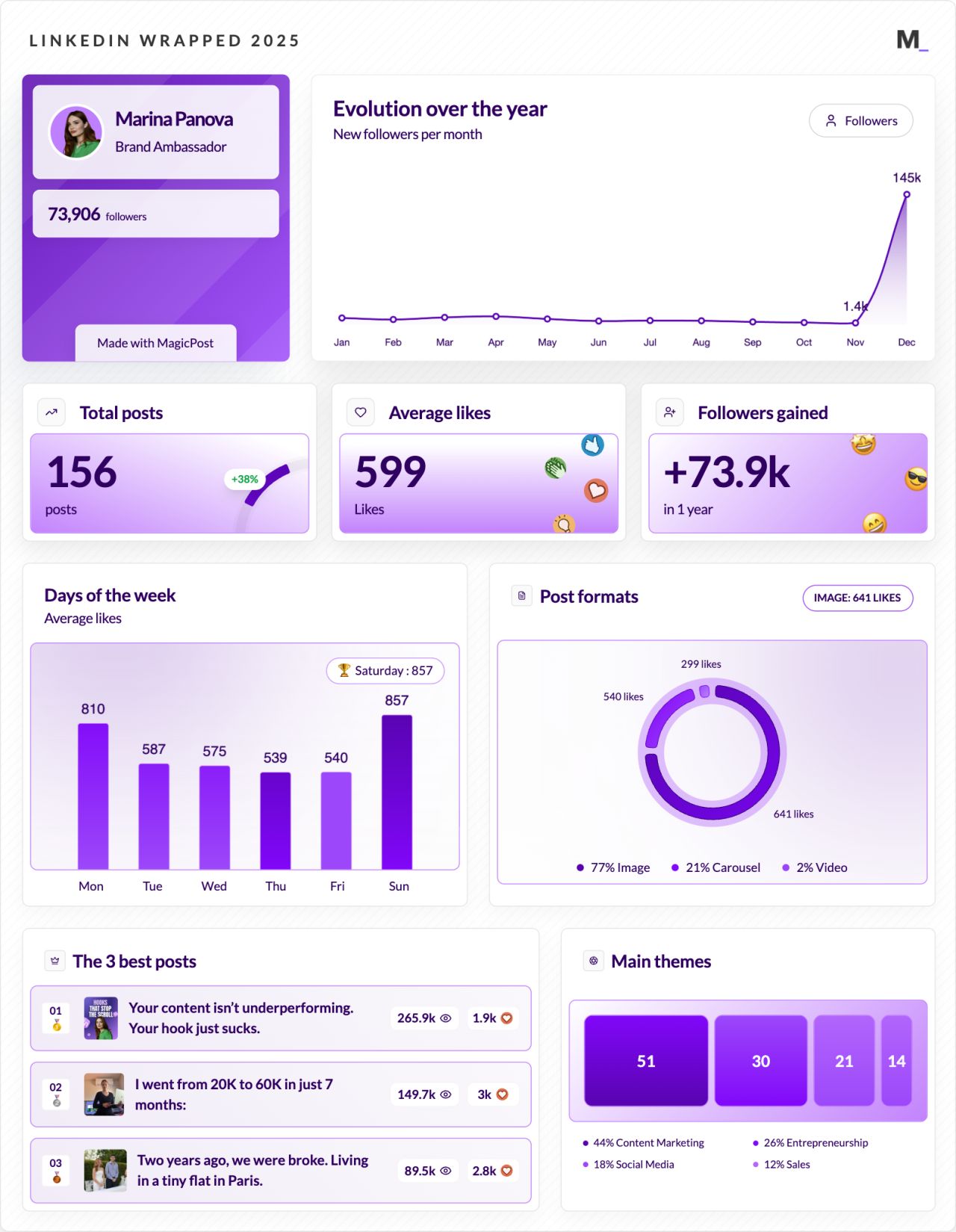 How did your LinkedIn really perform this year? Get a clear view of your followers gained, total impressions, and the topics that got the most engagement.